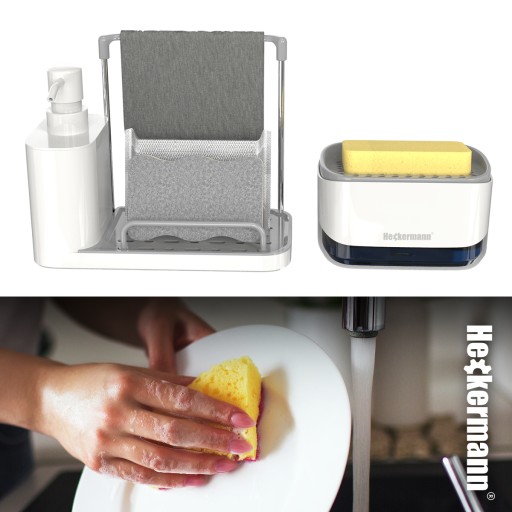 ⭐ Dozownik detergentów spełnia dwie funkcje - dzięki niemu wygodnie pobierasz płyn do mycia naczyń lub inny detergent na gąbkę, a także zyskujesz miejsce na odłożenie gąbki po zakończeniu prac sprzątających.