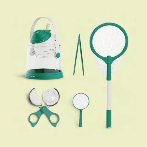 5-elementowy zestaw badawczy: stację obserwacyjną z dwoma komorami, siatkę, lupę, pęsetę, łapkę na owady