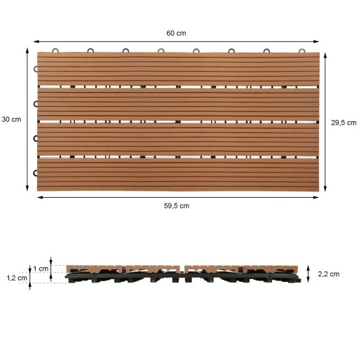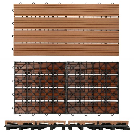 Ta płytka tarasowa z inteligentnym systemem wtykowym to stylowe i praktyczne rozwiązanie na balkon, taras, do ogrodu, do łazienki oraz do sauny i na basen. Płytki tarasowe są wykonane z wysokiej jakości materiału WPC, dzięki czemu są bardzo odporne na warunki atmosferyczne. Są również antypoślizgowe i nie odpryskują ani nie pękają. Płytki tarasowe są łatwe w utrzymaniu i nadają tarasowi czysty i zadbany wygląd.