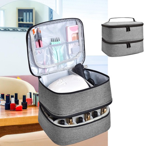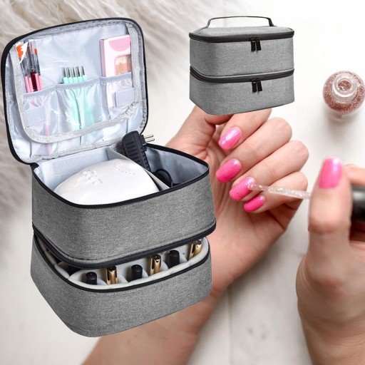 Dwuwarstwowa konstrukcja: podwójna komora, butelki z lakierem do paznokci i organizer na narzędzia, futerał do przenoszenia zapewnia porządek i porządek.