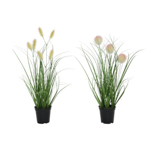 Wysokiej jakości sztuczna trawa z delikatnym kwiatostanem osadzona w czarnej, plastikowej donicy. Imitująca żywą naturalną roślinę.