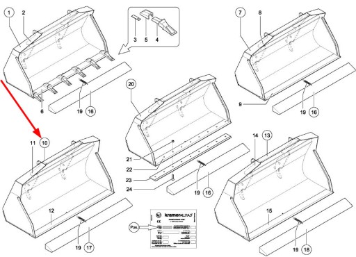 Oryginalna łyżka do materiałów sypkich o szerokości mocowania 865 mm z otworem fi 40, odstępie haka i otworu 300 mm, pojemności 1,05 m3, szerokości 2050 mm, głębokości 760 mm i numerze katalogowym 1000096393, stosowana w ładowarkach marki Kramer.