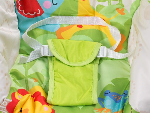 - W przedniej części bujaczka znajduje się panel dzięki któremu możesz włączyć uspokajające wibracje, wesołe melodie i odgłosy natury.