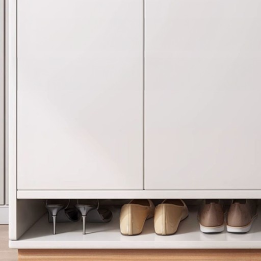 Drzwi otwierają się płynnie, dając łatwy dostęp do wnętrza szafki, gdzie znajdziesz odpowiednio rozmieszczone półki na buty.