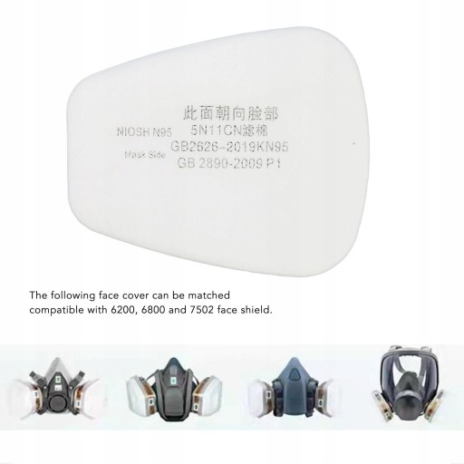 Funkcja:1. ODPOWIEDNIE DO OSŁON TWARZY: Gruby bawełniany filtr 5N11 jest odpowiedni dla różnych rozmiarów respiratorów i jest kompatybilny z osłonami twarzy 6200, 6800 i 7502.