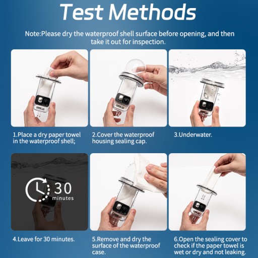 Materiał odporny na wysokie ciśnienie, z gumowym pierścieniem uszczelniającym, wodoodporność do 45 m / 147 stóp, bardzo odpowiedni do nurkowania, surfingu, snorkelingu, pływania i innych sportów wodnych, ale nadaje się również do fotografowania w deszczowe dni, bez obawy przed warunkami pogodowymi, bezmyślne strzelanie .