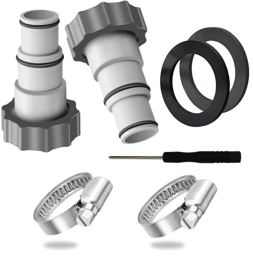 🌊【Zestaw adapterów do węża basenowego】 2-pak adapterów basenowych, wystarczająco dużo, aby używać lub zastąpić go w codziennym życiu. 2 obejmy węża i 2 podkładki żelowe, 1 mały śrubokręt dla bardziej wodoszczelnego połączenia.