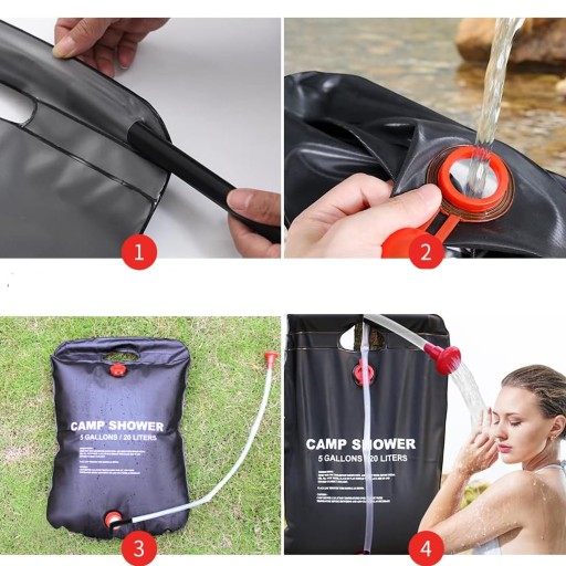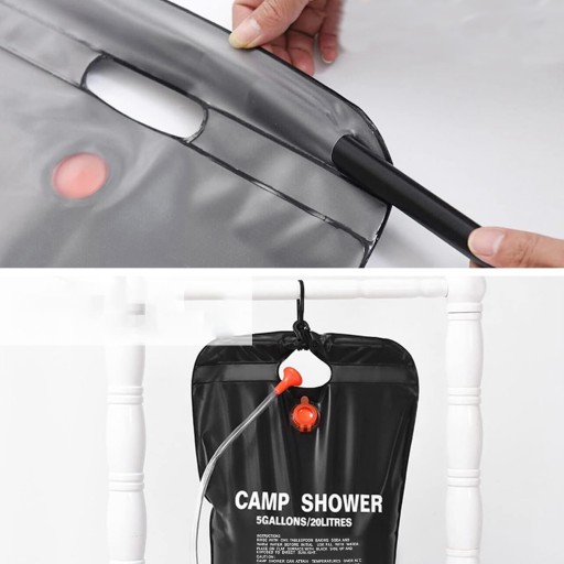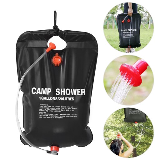 - Pojemność to 20L, duża pojemność pozwalająca na komfortowy prysznic bez obawy o wodę.