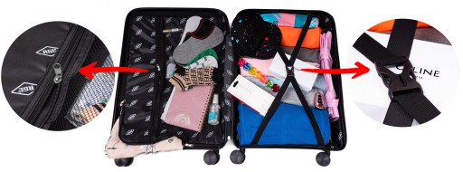 Wnętrze walizki podzielone jest na dwie komory. Jedna z nich posiada regulowane pasy chroniące bagaż, druga- na zamek, która posiada dodatkowo mniejszą kieszonkę na drobiazgi.