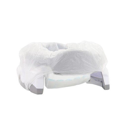 - Składa się z wielu akcesoriów – to produkt typu 2w1, czyli nocnik dla dziecka i jednocześnie nakładka na toaletę oraz wkłady jednorazowe.