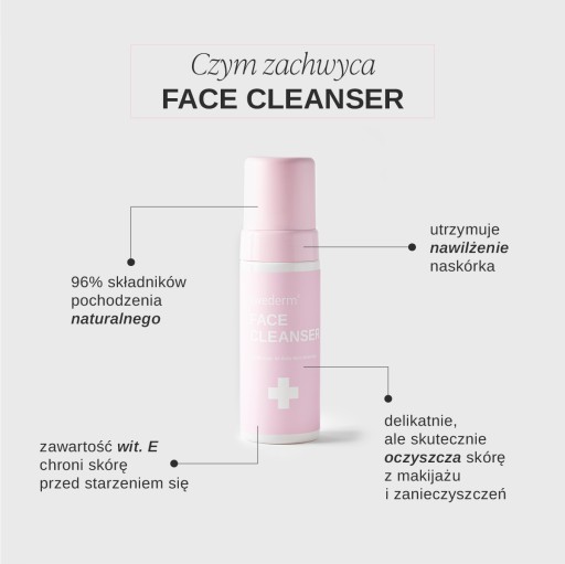 FACE CLEANSER to kosmetyk pielęgnacyjny o fizjologicznym pH. Unikalna formuła zawiera aż 96 proc. składników pochodzenia naturalnego! Dzięki temu pianka do demakijażu Swederm nie podrażnia skóry, ale przynosi jej upragnione nawilżenie i złagodzenie podrażnień. Do tego świetnie się pieni, rozprowadza na skórze i spłukuje, nie wywołując uczucia ściągnięcia. Delikatnie rozpuszcza i usuwa makijaż, tworząc na skórze barierę ochronną. Dzięki zawartości witaminy E hamuje naturalne procesy starzenia się skóry.