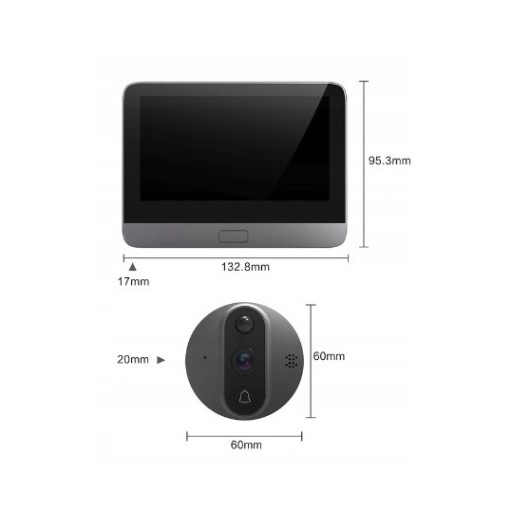 - Wymiary: ekran i podstawa: 132,8 x 95,3 x 17 mm, Kamera: 60 x 60 x 48.3 mm