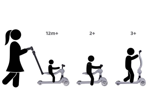 1. Początkowo posłuży jako jeździk. Dziecko siedząc może próbować odpychać się nóżkami i łapać równowagę. Opiekun może prowadzić i kontrolować jazdę dziecka za pomocą regulowanego prowadnika. 2. Po odpięciu prowadnika dziecko samodzielnie może jeździć na hulajnodze, wygodnie siedząc na siodełku. Podczas zabawy dziecko uczy się utrzymywać równowagę. 3. Trzeci etap dla starszej pociechy to trzykołowa hulajnoga balansowa, na której dziecko z radością może pokonywać alejki w parku!