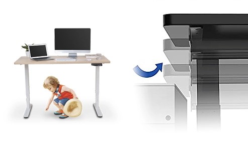 Stelaż biurka elektryczny został wyposażony w system antykolizyjny, które zdecydowanie zwiększa bezpieczeństwo na stanowisku pracy. Innowacyjna technologia zapobiegająca kolizjom powoduje, że biurko podczas zmiany wysokości cofnie się automatycznie, jeśli napotka przeszkodę na swojej drodze.