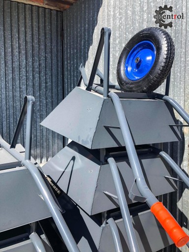 Wysokiej jakości solidna i trwała taczka o pojemności 90 litrów z tłoczonej blachy malowanej proszkowo na kolor, solidnej stalowej obręczy z dodatkowym podparciem misy i jedną oponą pneumatyczną z łożyskiem kulkowym na stalowej feldze.