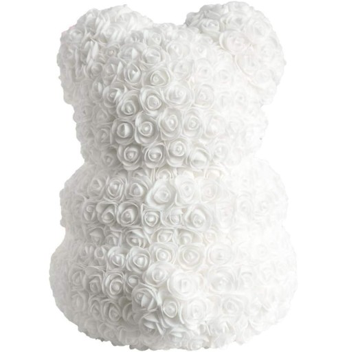 - Miś z białych róż trzymający czerwone serce.