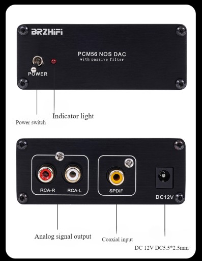 Dekoder odbiorczy koncentryczny DAC-56P obsługuje do 48 KHZ 16BIT. Razem z PCM63 powinien to być najbardziej klasyczny układ DAC firmy BB. Ma doskonałe wskaźniki wydajności i dobre wejście dźwiękowe i może być podłączony do dekoderów telewizyjnych, PS4, oraz różne odtwarzacze DVD Interfejs koncentryczny i złącze wyjściowe RCA do zewnętrznego zasilania wzmacniacza mocy lub aktywnych produktów głośnikowych, plug and play, bardzo wygodne.