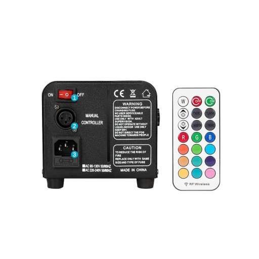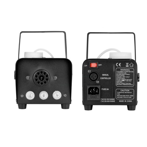 wytwornica dymu wykonana jest z wysokiej jakości materiałów – żelaza i aluminium – które lepiej odprowadzają ciepło i działają dłużej. 3 kolorowe diody LED RGB zapewniają fantastyczne efekty kolorystyczne. Zbiornik na wodę o pojemności 300 ml zapewnia długotrwałą produkcję mgiełki.