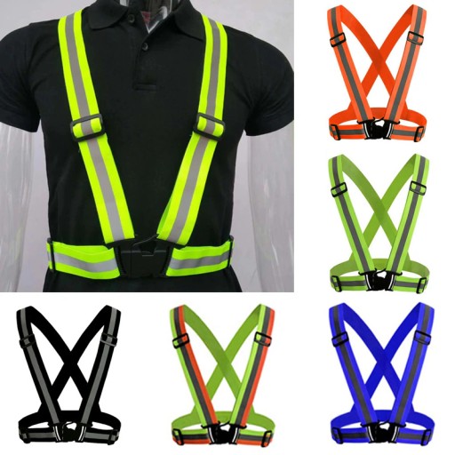 Kamizelka ostrzegawcza.Odblaskowa kamizelka typu szelki zakładana na klatkę piersiową doskonale poprawia widoczność na drodze nawet kilkukrotnie (szczególnie po zmierzchu), a tym samym Twoje bezpieczeństwo.