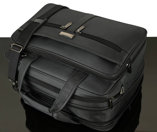 Rodzaj: Teczka/torba męska Przeznaczenie: elektronika, dokumenty, bagaż podręczny Konstrukcja: usztywniona elastyczną pianką Materiał: nylon/poliester Tkanina: wodoodporna Kolor: grafitowy Kolor okuć: grafitowy nikiel Kolor zamków: czarny Szerokość suwaków: 10 mm Wymiary: wysokość 31 cm , szerokość 43 cm, głębokość 25 cm Pomieści laptop do 15,9": Tak Pomieści segregator na dokumenty: tak Regulowana pojemność komory głównej: tak Maksymalna pojemność: 33 L Ilość komór: 3 Ilość kieszeni: 10 Ilość kieszeni zamykanych na suwak: 8 Organizer na telefony długopisy: Tak Uchwyty do ręki: Tak Pasek na ramię z regulacją: Tak Dwie możliwości mocowania paska: na bokach lub przód/tył Mocowanie do walizek na kółkach: Tak