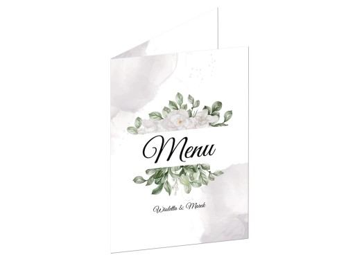 Do menu oprócz listy dań należy podać imiona pary młodej oraz datę wesela. Dane umieszczamy w formie: nagłówek + lista. Rozmiar czcionki zostanie dostosowany do listy menu. Przy długiej liście zalecane jest pisanie dań po przecinku, aby czcionka nie była zbyt mała. Tekst do menu prosimy umieścić w wiadomości do sprzedającego.