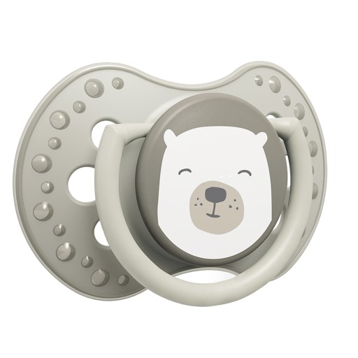 Smoczek ma unikalną budowę z niejednorodnego silikonu i symetryczny kształt inspirowany brodawką sutkową. Nie zaburza odruchu ssania i naturalnego rozwoju mowy i zgryzu.