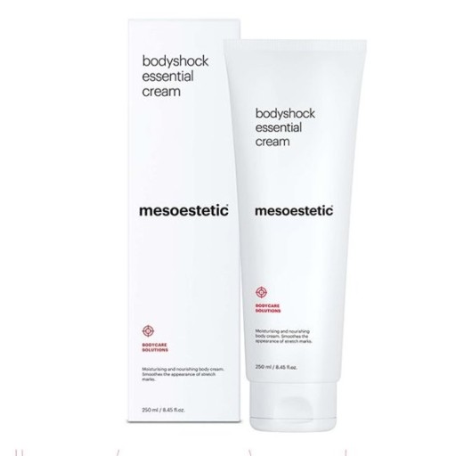 Bodyshock essential cream to krem do ciała renomowanej marki Mesoestetic, zmniejsza widoczność rozstępów. Jego formuła łączy kompleks ekstraktów roślinnych o uznanej skuteczności regenerującej, nawilżającej i równoważącej, takich jak ekstrakt Huang qi, z wąkrotką azjatycką, który poprawia jędrność i napięcie skóry, widocznie zmniejszając rozstępy i pomagając zapobiegać ich powstawaniu. Obecność olejków liposomalnych i masła Shea zapewnia działanie odżywcze i antyoksydacyjne.