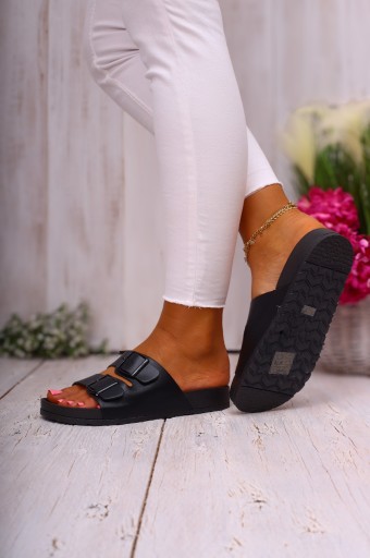 Klapki damskie w kolorze czarnym, idealne na każdą okazję. Wkładka ze skóry ekologiczne zapewnia komfort noszenia przy codziennym użytkowaniu. Wykonane z wysokiej jakości materiałów, są wygodne, i lekkie. Idealne na lato, na spacery, oraz wyjścia, są miękkie, cieszące się uznaniem wielu, dodają stylu.