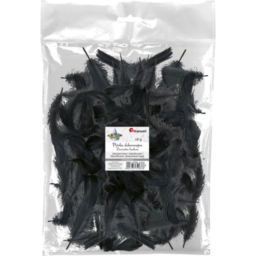 Piórka dekoracyjne, kolor: czarne. Opakowanie 16 g. Zestaw najwyższej jakości piórek dekoracyjnych. Posiadają bardzo szerokie zastosowanie, tym samym świetnie nadają się do samodzielnego wykonywania różnych prac plastycznych.