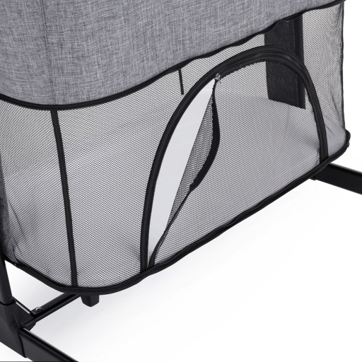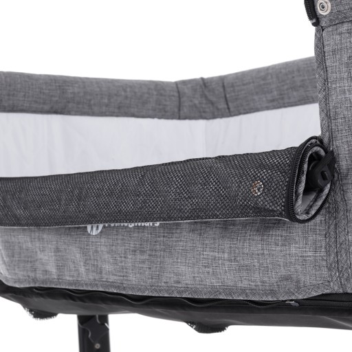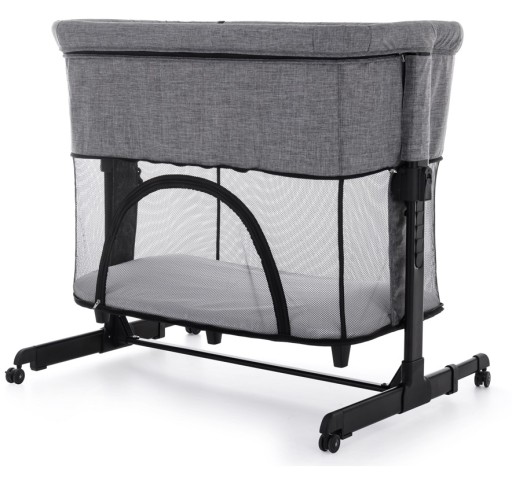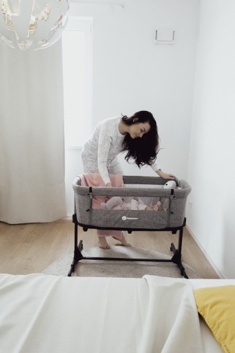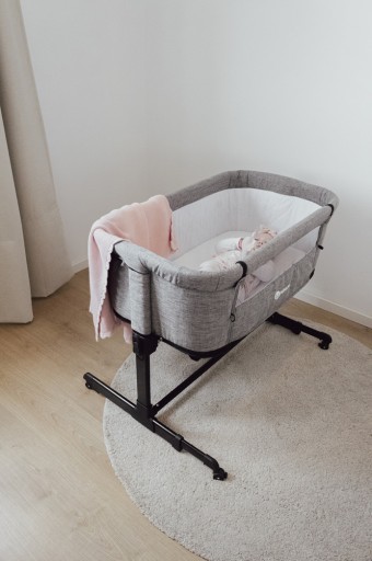 Łóżeczko ma regulowaną wysokość dzięki zdejmowanemu panelowi bocznemu, który można przymocować do łóżka rodzica, tak by dziecko było w zasięgu ręki.