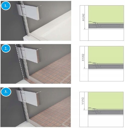 - UWAGA! Standardowo kabiny dopasowane są do montażu na brodziku o określonych wymiarach i właśnie te wymiary są podane w nazwie kabiny lub jej części. Rzeczywiste wymiary gabarytowe kabiny są nieco mniejsze od nominalnych podanych w nazwie artykułu. Jeśli planujesz montaż kabiny bezpośrednio na posadzce, zwróć uwagę na wymiary gabarytowe (X1, X2) oraz wymiary do osi szyby (Y1, Y2), które podane są na rysunku technicznym.