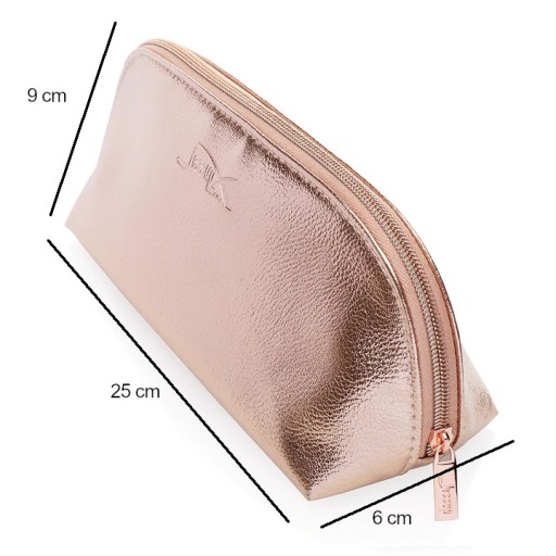 Cosmetic Bag CB008 marki JESSUP. Kosmetyczka. Wykonana została z trwałego, syntetycznego tworzywa w odcieniu różowego złota. Jest odporna na różnego rodzaju zabrudzenia, plamy oraz wodę. Posiada praktyczny i poręczny trójkątny kształt przypominający średniej wielkości piórnik / kosmetyczkę. Doskonale sprawdzi się do przechowywania ulubionego zestawu pędzli do makijażu oraz kosmetyków i innych akcesoriów. Środek został wyściełany wodoodpornym i plamoodpornym materiałem w odcieniu wanilii, który pięknie prezentuje się z całością.