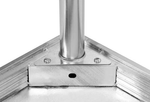 Blat stołu wykonany jest z masywnej blachy o grubości 0,8mm z dodatkowymi profilami wzmacniającymi. Dodatkowo blat wzmocniony jest od spodu drewnianą płytą laminowaną o grubości 20mm, która usztywnia go i wygłusza, a przy tym jest odporna na wilgoć. Dzięki temu blat może osiągnąć nośność wynoszącą do 150kg.