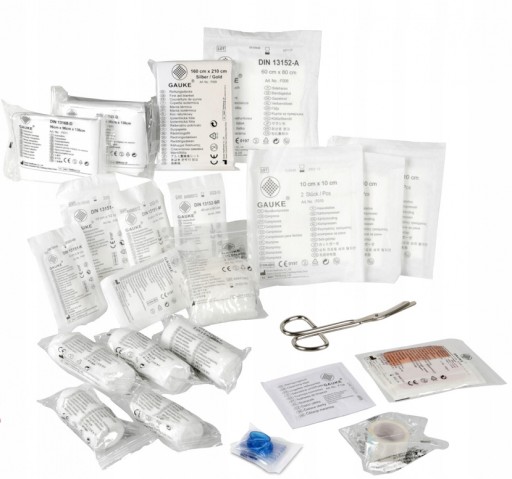 ► Zawiera dużą ilość opatrunków sterylnych, opasek elastycznych, plastrów, w tym sterylne opatrunki indywidualne typu „M" i „G" zawierające kompletny opatrunek wraz z kompresem, którym poszkodowana osoba bez trudu może opatrzyć się sama.