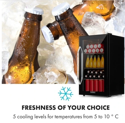 Przy swoich niewielkich wymiarach lodówka Klarstein posiada bardzo dużo miejsca do przechowywania: 80 litrów przestrzeni użytkowej na trzech metalowych półkach kratkowych zapewnia mnóstwo miejsca na różne produkty spożywcze, od jogurtu i sera po mięso i warzywa, ale także na chłodzenie napojów orzeźwiających. Dziesięć prowadnic na półki o rozstawie co 4 cm zapewniają wiele elastycznych możliwości aranżacji wnętrza urządzenia. Do chłodzenia do dyspozycji jest wybór 5 stopni regulacji mocy od 5 do 10 °C. Urządzenie Beersafe XXL Onyx robi szczególne wrażenie przede wszystkim dzięki rewelacyjnemu wyglądowi: szklane drzwi z czarną ramą zapewniają stały wgląd do wnętrza jednakowo czarnej konstrukcji. Samodzielnie włączana lampka LED we wnętrzu urządzenia oświetla przechowywaną żywność chłodnym białym światłem.