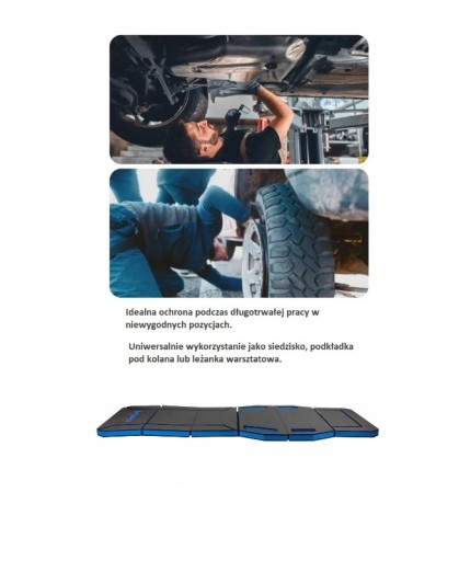 Wielofunkcyjna mata do naprawy samochodów, odporna na olej i benzynę, została zaprojektowana w celu ochrony kolan i pleców podczas pracy w garażu, warsztacie podczas napraw samochodów i podczas awaryjnej konserwacji pojazdów drogowych. Nadaje się również do pracy w ogrodzie lub w domku letniskowym.