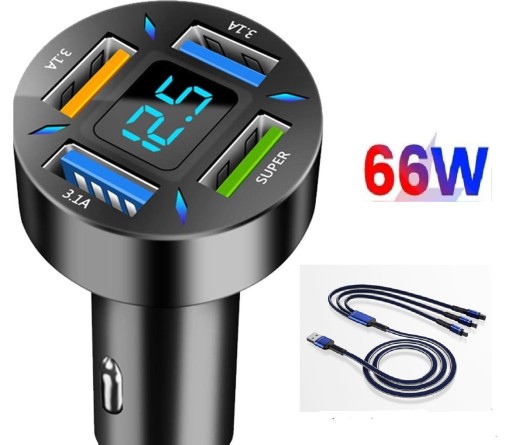 БЫСТРОЕ АВТОМОБИЛЬНОЕ ЗАРЯДНОЕ УСТРОЙСТВО 4xUSB 7A (3xQC) МОЩНЫЙ 66ВТ БЫСТРЫЙ КАБЕЛЬ 3-В-1