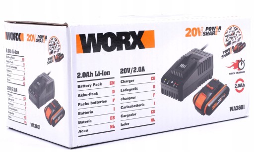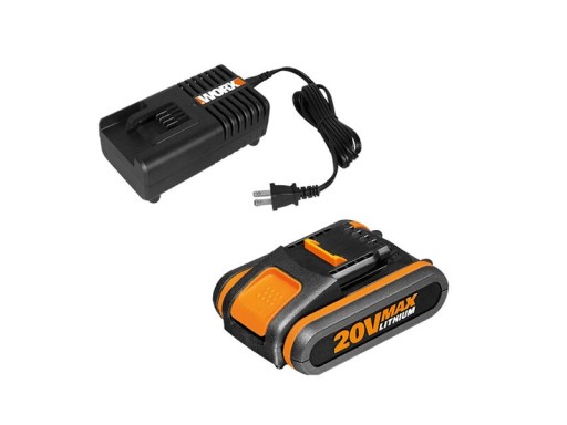 W skład zestawu wchodzą: akumulator litowo-jonowy Worx WA3551 20V o pojemności 2.0 Ah oraz szybka ładowarka Worx WA3860.
