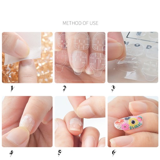 Są to dwustronne, klejące naklejki. Dzięki nim trwale przykleisz tipsy, bez uszkadzania płytki paznokcia. Należy wybrać odpowiedni rozmiar naklejki i przykleić ją na dokładnie oczyszczoną i odtłuszczoną płytkę paznokcia, a następnie przykleić do niej tips. Tips należy docisnąć, tak aby dokładnie przywierał do naklejki. Dzięki temu rozwiązaniu paznokcie i tipsy nie zostają uszkodzone przez tradycyjny klej do tipsów, a tipsy będą wielokrotnego użycia. Aby odkleić tips od naklejki należy patyczkiem podważyć tips, do momentu aż odklei się od naklejki Lub patyczkiem odkleić naklejkę od paznokcia wraz z tipsem.