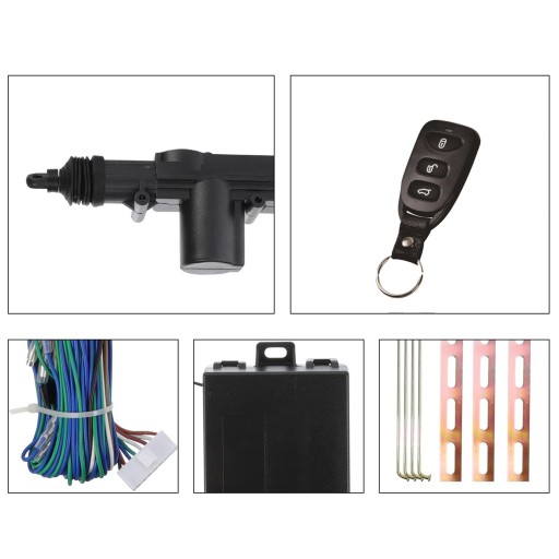 - Zestaw zamka centralnego składający się z centralki sterującej, 1 siłownika 5-przewodowego, 3 siłowników 2-przewodowych, dwóch pilotów zdalnego sterowania, przewodów połączeniowych, osprzętu instalacyjnego oraz schematu podłączenia