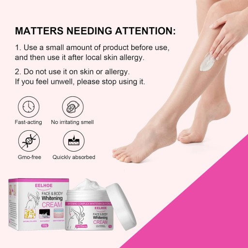 Stosujemy delikatną formułę. Ten wybielający krem nawilżający nie podrażnia skóry i jest szczególnie delikatny dla najbardziej wrażliwej skóry i obszarów ciała. Sprawi, że będziesz bardziej promienna i atrakcyjna.