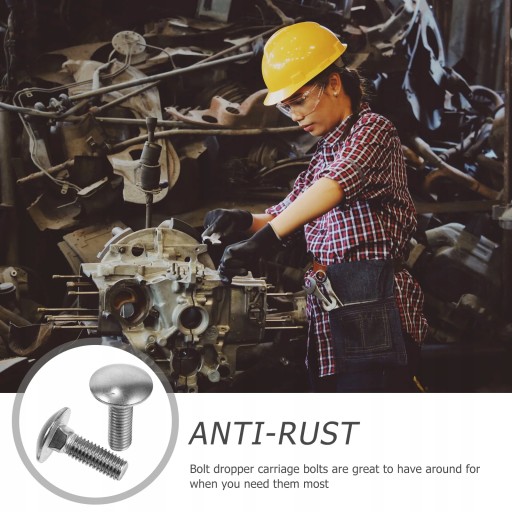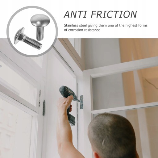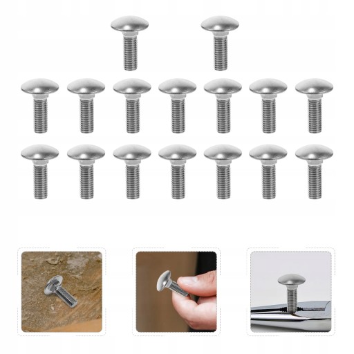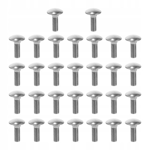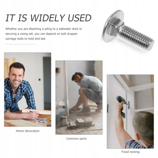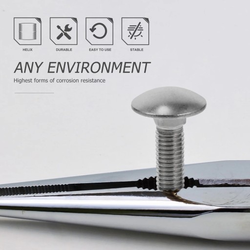 Okrągła kopulasta głowa z kwadratową szyją. Opakowanie zawiera po pięćdziesiąt sztuk śrub. Platerowane dla odporności na korozję. Nadaje się do użytku wewnątrz lub na zewnątrz. Wykonane z litej stali nierdzewnej pozwalają na stosowanie ich w różnych środowiskach, w tym w słonej wodzie, słodkiej wodzie, wewnątrz i na zewnątrz.