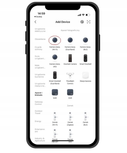 2️⃣ Otwórz aplikację Tuya lub Smart Life oraz dodaj nowe urządzenie - z zakładki "Aparat blokada" wybierz "Kamera bezprz. (Wi-Fi)"