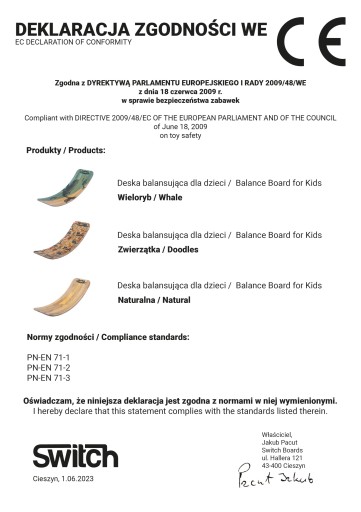 Modele desek Switch Kidboard zostały zarejestrowane w EUIPO. Prawa autorskie do tych wzorów są zastrzeżone, co oznacza, że nieuprawnione kopiowanie jest zabronione.