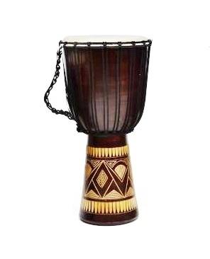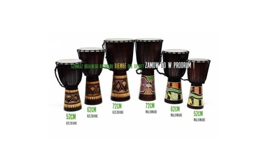 Djembe wykonywane są w 100% ręcznie z naturalnych materiałów w wersji malowanej lub rzeźbionej oraz w trzech różnych rozmiarach.