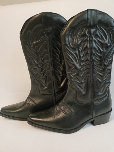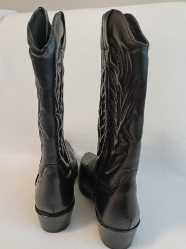 Marka Grigos specjalizuje się w produkcji obuwia skórzanego, szczególnie dla mężczyzn. Kowbojki wykonane z czarnej skóry licowej. Rozmiar 7, dla EU-40. Wciągane. Góra cholewki zaokrąglona, ozdobnie przeszywana. Przód zdobiony przeszywanym ornamentem. Wewnątrz poliestrowa warstwa materiału.