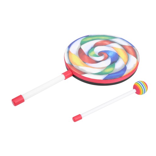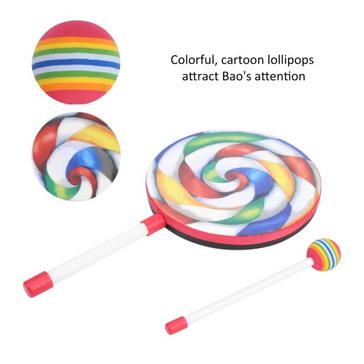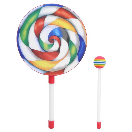 1. Ten bęben w kształcie lizaka ma jasne kolory i urocze kształty, które z łatwością mogą przyciągnąć uwagę dzieci.