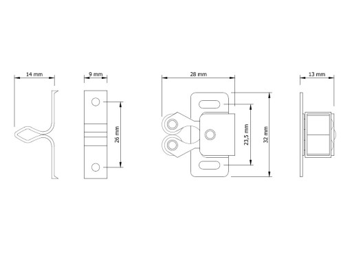✅ Zatrzask rolkowy, wałeczkowy do mebli posiada 2 elementy. Pierwszy przykręcany do drzwiczek z zaczepem o rozmiarze płytki 9 x 32 mm, posiada 2 otwory o rozmiarze 3,0 mm. Drugi element przykręcany jest wewnątrz szafki o rozmiarze 32 mm szerokości, 28 mm długości, 13 mm wysokości - przykręcany na dwa otwory.