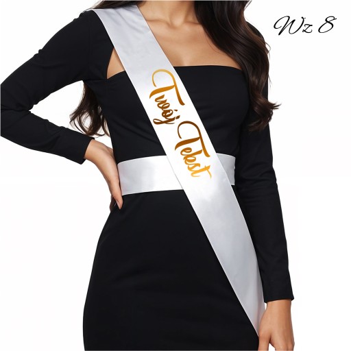 Eleganckie i modne satynowe szarfy to doskonały wybór. Biała szarfa ze złotym napisem dostępna w 8 wzorach będzie znakomitym uzupełnieniem dla głównej bohaterki jak i całej ekipy wieczoru.