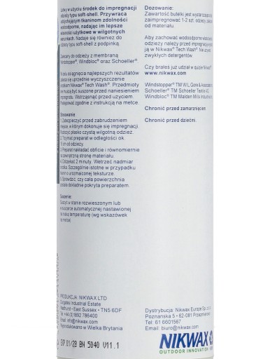 - Nadaje/odnawia właściwości wodoodporne i odświeża zdolność do „oddychania” odzieży typu soft-shell;